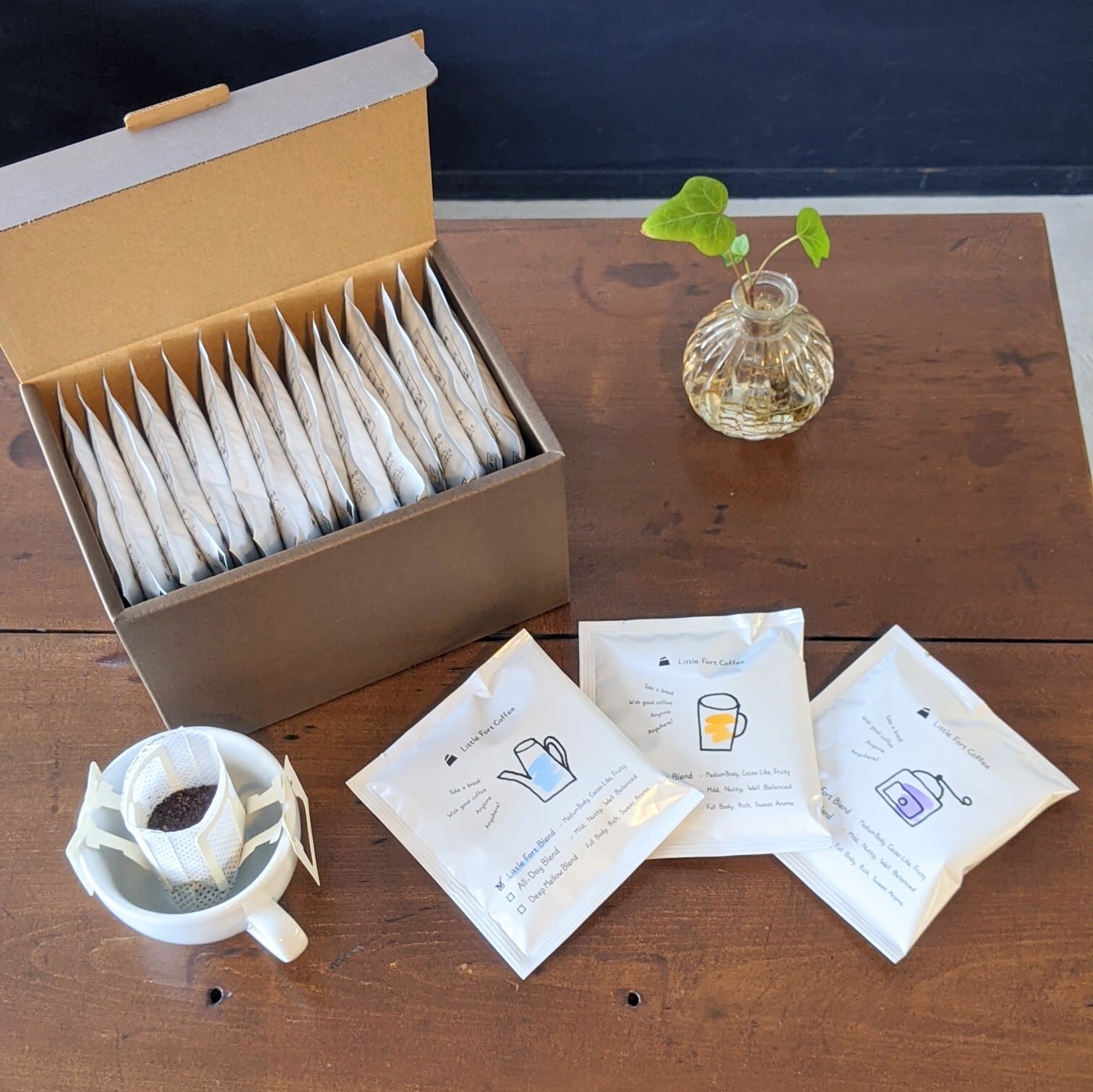 リトルフォートブレンド、オールデーブレンド、ディープメロウブレンドのドリップパックが5個ずつ、合計15個入ったギフトです。